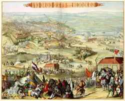 La invasión sueca de la República de las Dos Naciones al año siguiente empezó la Segunda Guerra Nórdica.[35] Federico Guillermo ofreció protección a las ciudades reales prusianas en el tratado de Rinsk, pero tuvo que rendirse a la supremacía militar sueca y retirarse a su ducado prusiano.[36] Perseguido por fuerzas polacas hasta la capital de Prusia,[37] Federico Guillermo hizo la paz y se alió con los suecos, tomando el ducado de Prusia y Ermland (Ermeland, Warmia) como feudos de Carlos X Gustavo de Suecia en el tratado de Königsberg en enero de 1656.[38] La alianza demostró ser victoriosa en la batalla de Varsovia en junio, elevando la reputación internacional del elector.[7] La continua presión sobre Carlos X Gustavo dio como resultado que el rey sueco reconociera la plena soberanía en el ducado de Prusia y Ermland a Federico Guillermo por el tratado de Labiau en noviembre para asegurar el mantenimiento de la alianza.[39] El tratado de Radnot, concluido en diciembre por los suecos y sus aliados, avanzaron aún más, concediendo la Gran Polonia a Brandeburgo-Prusia en caso de una victoria.[39]