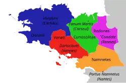 - Los Vénetos, que vivían en el actual departamento de Morbihan y dieron su nombre a la ciudad de Vannes. A pesar de la confusión del erudito clásico Estrabón, no estaban emparentados con los Vénetos del Adriático.