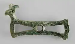 Otra clase habitual de bronces son parejas de carrilleras de bocados; cuando están enteros vienen con una barra entre ellas que va a la boca del caballo. Hay a menudo anillos en las artes superior o trasera de las placas, para asegurar que se aten las riendas alrededor de la cabeza del caballo. Son placas planas caladas, con un agujero central reforzado para que los atraviesen los bocados; hay conjuntos completos y en ellos están sujetados en su sitio por los finales de la barra del bocado curvada hacia atrás.[33]