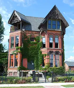 1869 | 227 Adelaide Street | Victoriano, italianizante | Una de las estructuras existentes más antiguas en Brush Park, la casa fue construida en 1869 y originalmente propiedad de Horace Sumner Tarbell (1838-1904), Superintendente de Instrucción Pública de Míchigan de 1876 a 1878.[81] Durante las siguientes décadas, la propiedad cambió de manos varias veces antes de ser abandonada y deteriorada. | |