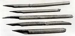 Se utilizó en Mesopotamia como un instrumento para incidir o grabar, en tablillas de arcilla, la denominada escritura cuneiforme, por la forma de cuñas característica.