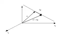 {\displaystyle {\begin{array}{l}{\big \{}\mathbf {e} _{1},\ldots ,\mathbf {e} _{n}{\big \}},f_{L}{\big (}\mathbf {y} {\big )}=f_{L}{\big (}\sum _{k=1}^{n}y_{k}\mathbf {e} _{k}{\big )}=\sum _{k=1}^{n}y_{k}f_{L}{\big (}\mathbf {e} _{k}{\big )}=\sum _{k=1}^{n}y_{k}f'{\big (}\mathbf {x} ;\mathbf {e} _{k}{\big )}=\\\sum _{k=1}^{n}y_{k}{\cfrac {\partial f}{\partial x_{k}}}\end{array}}}