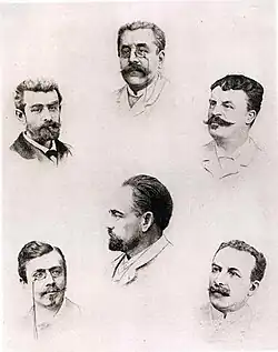 El Groupe de Médan: Siguiendo el sentido horario, desde arriba: Paul Alexis, Guy de Maupassant, Henry Céard, Léon Hennique y Joris-Karl Huysmans. En el centro, Émile Zola.