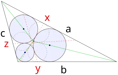 Un círculo que es tangente a dos lados de un triángulo, como son los círculos de Malfatti, debe tener su centro en una de las bisectrices del triángulo (líneas de color verde en la figura). Estas bisectrices dividen el triángulo en tres triángulos más pequeños, y la construcción de Steiner de los círculos de Malfatti comienza dibujando los tres círculos inscritos en estos triángulos más pequeños (representados con trazos discontinuos). Cada par de estos tres círculos inscritos tiene dos bitangentes, líneas que tocan los dos círculos discontinuos y pasan entre ellos: un bitangente es la bisectriz del ángulo, y la segunda bitangente se muestra como la línea roja discontinua en la figura. Designando los tres lados del triángulo dado como a, b y c, y denominando las tres bitangentes que no son bisectrices como x, y y z, donde x es la bitangente de los dos círculos que no tocan el lado a, y es la bitangente a los dos círculos que no tocan el lado b, y z es la bitangente a los dos círculos que no tocan el lado c. Entonces, los tres círculos de Malfatti son los círculos inscritos en los tres cuadriláteros circunscritos abyx, aczx, y bczy.[10] Las tres bitangentes x, y y z cruzan los lados del triángulo en el punto de la tangencia con cada círculo inscrito, y pueden también ser determinadas como las reflexiones de las bisectrices tomando como ejes las líneas que conectan pares de centros de estos círculos inscritos.[7]
