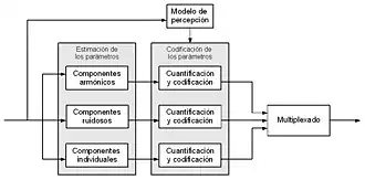 AAC (Advanced Audio Coding) HE-AAC (High Efficiency Advance Audio Coding) AC3 (Dolby Digital A/52) ADX (videojuegos) ATRAC (Adaptive TRansform Acoustic Coding) DRA DTS (Digital Theather Systems) MP1 (MPEG audio layer-1) MP2 (MPEG audio layer-2) MP3 (MPEG audio layer-3) Perceptual Audio Coding RTA (Real Time Audio Codec) WMA (Windows Media Audio) |