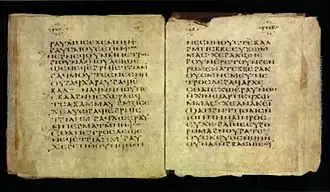 En su Historia Natural, Plinio cuenta que el pergamino se originó en la ciudad de Pérgamo en época de Eumenes II (195-158 a. C.), de donde habría tomado el nombre, aunque hallazgos como los de Dura-Europos hacen dudar de esta afirmación. Los especialistas consideran que la aportación de Pérgamo debió consistir más bien en el perfeccionamiento de las técnicas de fabricación.[7] El formato del codex tenía su antecedente en los polípticos o tablillas de cera. El pergamino era más caro que el papiro debido a que se necesitaban varias pieles para un solo libro, lo que suponía el sacrificio de varios animales. Sin embargo, el pergamino poseía muchas ventajas: era menos quebradizo y más resistente, podía doblarse (lo que hacía los libros más manejables), podía lavarse y podía rasparse (lo que facilitaba las enmiendas de errores), podía coserse (lo que permitía la encuadernación y su mejor conservación) y podía escribirse por las dos caras en hojas opistógrafas (lo que ahorraba espacio). Estas ventajas técnicas y prácticas acabarían por imponerse sobre el papiro y los tradicionales libros copiados en forma de rollo. Además, algunos de los ejemplares más lujosos se hallaban teñidos de oro o púrpura y sus encuadernaciones podían tener incrustaciones de materiales preciosos, como joyas engarzadas o tapas de oro, plata o marfil trabajadas con relieves.