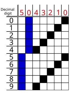 Valor Bits 50-43210 0 01-00001 1 01-00010 2 01-00100 3 01-01000 4 01-10000 5 10-00001 6 10-00010 7 10-00100 8 10-01000 9 10-10000