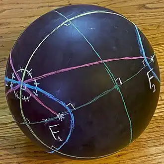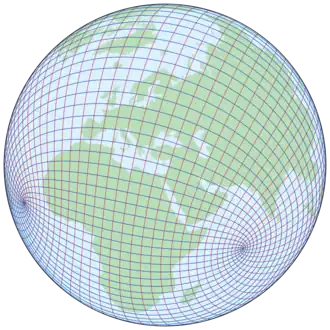 Diacu, Florin (2013). «The curved N-body problem: risks and rewards». Mathematical Intelligencer 35 (3): 24-33. - ↑ Cox, Jacques-François (1946). «The doubly equidistant projection». Bulletin Géodésique 2 (1): 74-76. doi:10.1007/bf02521618.