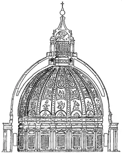 Una cúpula hemiesférica, parabólica o elipsoidal es una figura o lugar de puntos generados a partir de un arco que gira en torno a un eje vertical, denominada en este caso cúpula de revolución.[nota 12]Está formada por piezas llamadas dovelas que se disponen en forma de arco hasta la dovela superior o clave, que equilibra los esfuerzos de manera análoga a un arco o bóveda pero en tres dimensiones. Para permitir la entrada de luz al interior de la cúpula puede abrirse un óculo cenital, acompañado o no de una linterna. Para ello se sustituye la clave por un anillo superior de piezas que resistan los esfuerzos de compresión, en ocasiones realizado en bronce para una mayor estabilidad y durabilidad.[nota 13] Teóricamente, siempre es posible construir una cúpula de revolución, puesto que está constituida por infinitos anillos que se sujetan por sí mismos una vez completados. La técnica constructiva es bastante sencilla: los ladrillos se disponen en anillos circulares concéntricos superpuestos, cuyo diámetro disminuye a medida que se eleva hacia la cúspide. De este modo la estructura es autoportante, es decir, capaz de sujetarse por sí misma.[72]