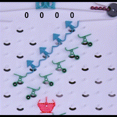 - Bits (azules) con dos estados (posiciones) que, según su estado, dirigen la bola en una u otra dirección, cambiando así su estado. También hay bits conectados (bits de rueda dentada en púrpura y rojo), donde el cambio de estado de un bit provoca el cambio de estado de otros bits conectados mediante engranajes, que pueden utilizarse, por ejemplo, para... a. Se pueden realizar estados persistentes y lecturas no destructivas.