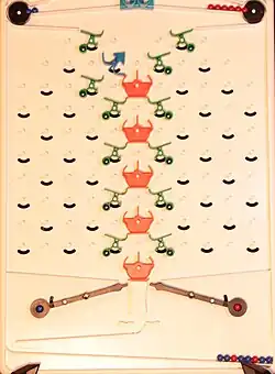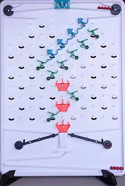 En un tablero de juego casi vertical, las bolas que caen son guiadas por bloques de construcción enchufables. Cada bloque puede cambiar entre dos posiciones (bits), lo que modifica la trayectoria de la siguiente bola. Solo hay una bola en movimiento a la vez. Las bolas se liberan de uno de los dos depósitos superiores (el izquierdo para las bolas azules y el derecho para las rojas) mediante una palanca en la parte inferior del tablero. La palanca izquierda libera una bola del depósito izquierdo y la palanca derecha, del depósito derecho. Inicialmente, una de las palancas se libera manualmente. La trayectoria establecida conduce la bola que cae hacia una de las dos palancas, que libera automáticamente la siguiente bola del depósito asignado. El proceso finaliza cuando el depósito que debe proporcionar la siguiente bola está vacío o cuando la bola es guiada hacia un bloque de construcción recolector y, por lo tanto, ya no puede liberar una nueva bola. El objetivo del juego puede ser crear un patrón predeterminado de bolas azules y rojas en el canal colector al fondo del área de juego o lograr ciertas constelaciones de bloques cambiantes. Estos bloques de dos posiciones pueden interpretarse como bits y, por lo tanto, representar memoria o contadores.[4]