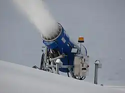 - Cañones ventiladores: Son muy diferentes a los otros dos porque requieren electricidad para alimentar un ventilador y un pequeño compresor. El ventilador propulsa el agua comprimida hacia delante congelándola. El pequeño compresor que incorporan permite a estos cañones operar en áreas donde no hay instalación previa de aire comprimido. En algunas estaciones que hacen uso de este tipo de cañones no se instala la planta de aire, lo que supone un ahorro considerable.