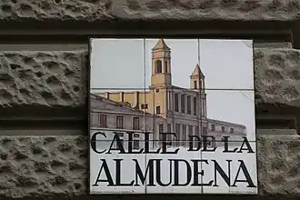 ![]() Placa de azulejos del callejero del Madrid antiguo con una vista de la catedral de La Almudena, hacia 2000 (la representación no hace referencia a la iglesia de Santa María de la Almudena, demolida en 1868, y que se encontraba en esta calle). | ||