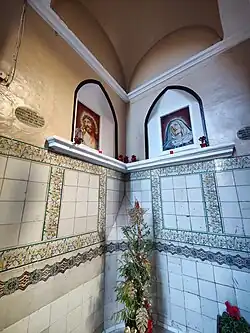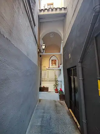 En los dos muros que forman la esquina, y funcionando como final de perspectiva de los tramos de la calle, hay una hornacina con forma de arcos apuntados y bajo ellos una repisa moldurada corrida. En estas capillitas se situaron las imágenes originales del siglo XVII, que en el siglo XIX serían sustituidas por sendos lienzos obra de Bernardo Mundina Milallave, que fueron destruidos en agosto de 1936 en los albores de la guerra civil española.[9] Tras el final de la contienda, se colocaron dos paneles cerámicos devocionales obra de Vicent Castell con un tamaño total de 80 x 60 cm organizados en 3 hileras de 4 azulejos de 20 x 20 cm, representando al Ecce homo con corona de espinas y túnica azul sobre los hombros y a Nuestra Señora de los Dolores con manto azul y signos de dolor en su rostro.[10]
