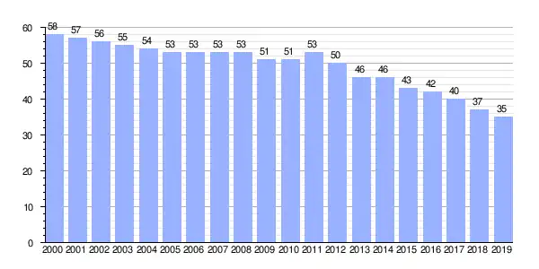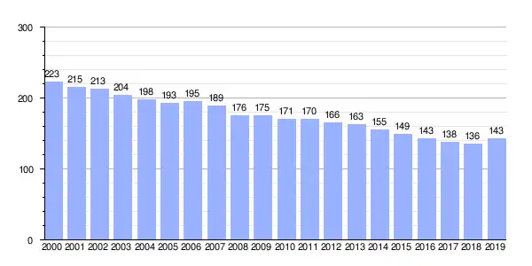 | Gráfica de evolución demográfica de Calvos (aldea) entre 2000 y 2019 |