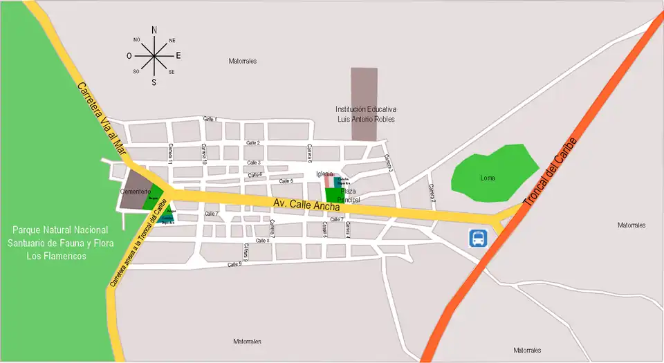 En este lugar desembocan arroyos y riachuelos aledaños, inundando un vasto terreno conocido como la ciénaga Navío Quebrado y laguna Grande que en los meses lluviosos, el agua se desborda abriendo las líneas costeras (o bocas) permitiendo la entrada del agua del mar. Este estuario de mangles costeros es el parque nacional natural Santuario de fauna y flora los Flamencos hábitat temporal de flamencos rosados, que obtienen ese color por el consumo de artemias.