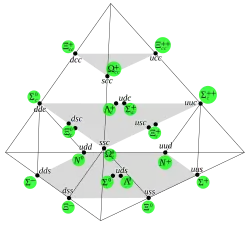 Como las rotaciones de sabor son simetrías aproximadas, no exactas, cada estado ortogonal en el espacio vectorial corresponde a una especie de partícula diferente. En el ejemplo anterior, cuando un protón se transforma por cada rotación de sabor posible , resulta que se mueve en un espacio vectorial de dimensión 8. Estas 8 dimensiones corresponden a las 8 partículas en el "octete de bariones" (protón, neutrón, Σ+, Σ0, Σ−, Ξ−, Ξ0, Λ). Esto corresponde a una representación de dimensión 8 ("octete") del grupo SU(3). Dado que es una simetría aproximada, todas las partículas en este octete tienen masa similar.