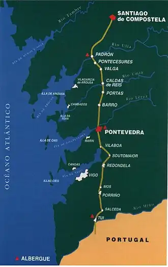 La despedida portuguesa se produce en Valença do Miño, para ya encontrarse con Tuy y posteriormente con Pontevedra, capital del camino portugués.[1] Caldas de Reyes y Padrón son el preámbulo antes de alcanzar Santiago de Compostela.
