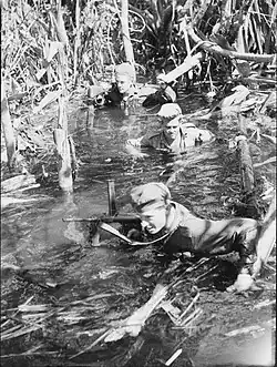![]() Soldados del ejército de los Estados Unidos cazan infiltrados japoneses en Bougainville en marzo de 1944. | ||||