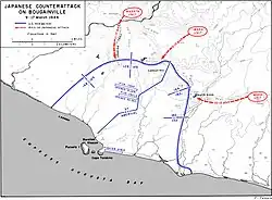 El 15 de diciembre de 1943, el I Cuerpo Anfibio de Marines fue reemplazado por el XIV Cuerpo del Ejército[7] y el 28 de diciembre, la 3.ª División de Marines por la División Americal. El XIV Cuerpo defendió la cabeza de playa contra un importante contraataque japonés entre el 9 y el 17 de marzo de 1944, en Hill 700 y Cannon Hill, los cuales fueron derrotados por la 37.ª División de Infantería de Ohio, y en Hill 260, la cual fue defendida por la División Americal. El contraataque fue repelido con fuertes bajas para el ejército japonés, el cual, por su parte, replegó la mayoría de sus fuerzas al interior y a los extremos sur y norte de Bougainville.[22]