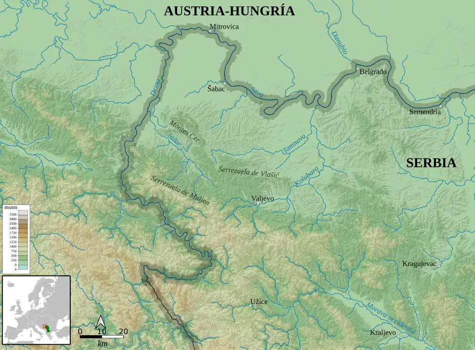 El este de Serbia era, en general montañoso, y protegía el vital ferrocarril que recorría el país de norte a sur y comunicaba con Grecia.[34] Era la vía de comunicación con Francia y el Reino Unido y de abastecimiento desde el exterior.[34] En el norte, por el contrario, abundaban las colinas.[34] El Sava, que marcaba la frontera con Austria-Hungría, atravesaba una llanura cenagosa carente de puentes al oeste de Belgrado.[34] El río era demasiado hondo para poderse vadear e inundaba el terreno circundante en primavera y otoño.[34] Al este de Belgrado la frontera seguía el curso del ancho Danubio, que carecía de puentes en la zona y tenía más de un kilómetro de ancho.[35] En el este, el Drina marcaba fundamentalmente la frontera entre Serbia y Austria-Hungría.[35] El caudal del río cambiaba notablemente según la estación, pero se podía vadear en diversos lugares, si bien las orillas eran a menudo empinadas y estaban rodeadas de montañas boscosas.[35] Tampoco había puentes que uniesen las dos orillas del Drina que, al desembocar en el Sava, formaba la esquina noroccidental de la región de Moesia, llana y cenagosa.[35] Las montañas cubrían la zona meridional de la frontera occidental, pero tras ellas tres pasillos daban acceso al del Gran Morava, el núcleo de Serbia: el del Jadar-Kolubara que, encerrado entre las sierras de Vlašić (al norte) y de Maljen (al sur) en la zona occidental, llevaba del Drina a Belgrado pasando por Valjevo; el del Morava Occidental, una vez superados los montes al oeste de Užice; y el de los ríos Uvac-Lim-Ljudska hasta Novi Pazar.[36]