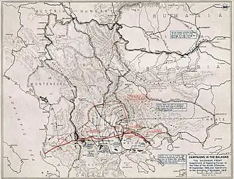 A pesar de que se llevaron a cabo con gran esmero,[nota 1] los preparativos de la ofensiva aliada contra las líneas germano-búlgaras en Macedonia no pasaron desapercibidos al reconocimiento aéreo enemigo; el mando de los Imperios Centrales cambió de posición algunas unidades para hacer frente al embate, que creía iba a ser baladí.[8] El 15 de septiembre de 1918, las tropas francesas y serbias atacaron las posiciones alemanas y búlgaras, machacadas previamente por un potente bombardeo de artillería.[9] Tras abrir brecha en las defensas el 18 de septiembre, los atacantes avanzaron por los valles del Vardar y el Crna; las unidades alemanas y búlgaras a duras penas lograron frenarlas.[10]