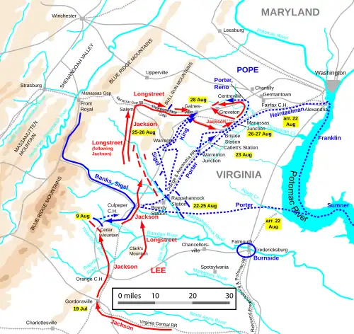 Preocupado con la posibilidad de que el ejército de Pope se uniera con el Ejército del Potomac del general de división George B. McClellan y fuera derrotado por la aplastante superioridad numérica, Lee envía al general de división Thomas J. Jackson al norte para interceptar el avance de Pope hacia Gordonsville. Las dos fuerzas se enfrentarán en Cedar Mountain el 9 de agosto, produciéndose una victoria confederada. Considerando Lee que el Ejército del Potomac en la Península de Virginia no es ya una amenaza para Richmond, envía a una gran parte de su ejército, al mando del general de división James Longstreet, tras Jackson. Jackson realiza una amplia maniobra alrededor del flanco derecho de Pope, tomando un gran depósito de suministros en Manassas Junction, y situando a sus fuerzas entre el Ejército de Virginia y Washington. Aprovechando una buena posición defensiva cerca del campo de batalla de la Primera batalla de Bull Run Jackson contiene con éxito los continuos asaltos de la Unión el 29 de agosto mientras las tropas de Longstreet se van aproximando. El 30 de agosto Pope ataca de nuevo, pero sus tropas fueron sorprendidas por las unidades de Longstreet, viéndose forzado a retirarse con graves pérdidas. La campaña finaliza con otra maniobra de flanqueo de Jackson en la que Pope se ve obligado a retirarse sobre la capital tras la batalla inconclusa del 1 de septiembre en