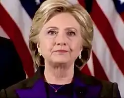 Clinton concedió la derrota en las elecciones presidenciales de 2016 ante el republicano Donald Trump el 9 de noviembre después de que los medios de comunicación declararan que Trump había superado el umbral de 270 votos del colegio electoral requerido para ganar las elecciones y poner fin a la campaña.[10] Si Clinton hubiera sido elegida, habría sido la primera mujer y la primera esposa de un presidente de los Estados Unidos (Bill Clinton) en ganar ella misma la presidencia. Bill Clinton también se habría convertido en el primer caballero de Estados Unidos.