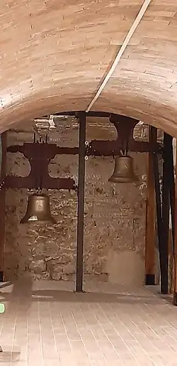 El campanario cuenta con 10 campanas, tocadas manualmente a diario por la sacristana de la parroquia y por los campaneros. 7 de ellas se encuentran en la sala de campanas y otras 3 en la parte del reloj. Cada campana tiene un nombre identificativo y una nota asignada, las cuatro más importantes son:[9]