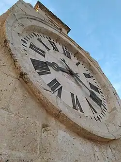 El campanario empezó a construirse en el año 1615, obra que finalizó 5 años después.[4] El material utilizado para su construcción fue la piedra tosca. Se trata de un campanario de planta cuadrada con una altura de 40 metros. Cuenta con 10 campanas, la más antigua data del año 1808 y las más nuevas se colocaron en el año 2003 después de la restauración del campanario. En el año 1857 se le añadió el reloj, que se puede ver desde diferentes puntos de la localidad,.[5][6]