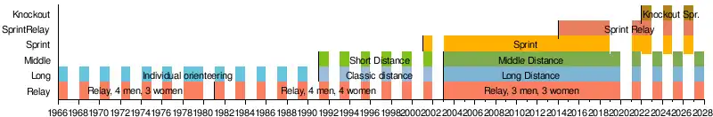 Originalmente, solo había dos competiciones: una carrera individual y una de relevos. En 1991, se agregó una carrera de corta distancia (aproximadamente 20 a 25 minutos) y una carrera sprint en 2001. La distancia media (aproximadamente 30-35 minutos) reemplazó a la distancia corta en 2003. En 2014 se añadió un relevo sprint con la participación de dos hombres y dos mujeres y con orden de salida mujer-hombre-hombre-mujer.