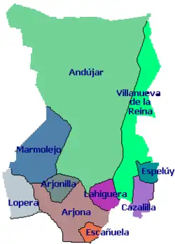 Tradicionalmente,[1] se consideraba que esta comarca estaba compuesta por los municipios de Andújar, Arjona, Arjonilla, Cazalilla, Escañuela, Espeluy, Lahiguera, Lopera, Marmolejo, Mengíbar, Porcuna, Santiago de Calatrava y Villanueva de la Reina.