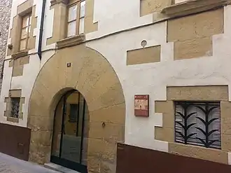 En cuanto al primer piso, este se trata de la planta noble como muy bien lo acreditan las tres aberturas majestuosas que aquí se concentran. En el centro hay una gran ventana de arco conopial con decoración lobulada y ondulada, con montantes de piedra y antepecho trabajado. En ella destaca el trabajo de las impostas del arco con unos minúsculos motivos -rosetones- como el del encuadre resuelto con un guardapolvo. A la izquierda hay una ventana de idéntica tipología y proporciones que el anterior. Pero se diferencia de la anterior en tres sentidos. En primer lugar, la ventana es de arco conopial con decoración lobulada pero no contiene el complemento de la ondulación. En segundo lugar, los motivos de las impostas -rosetones- aquí son de tamaño sensiblemente mayor. Y en tercer lugar, debajo del alféizar trabajado encontramos la solución que consiste en disponer tres piedras como medida de refuerzo y apoyo en la sustentación de la pesada ventana. A la derecha, hay una gran ventana rectangular, con dintel monolítico conformando un arco plano, montantes de piedra bien escuadrados y antepecho trabajado debajo del cual se repite la misma solución que vemos en la ventana de la izquierda y que consiste en disponer tres piedras bajo el alféizar como medida de refuerzo.[1]