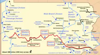 ![]() Mapa de canales en Pensilvania. La Línea Principal de Obras Públicas se muestra en rojo. | ||