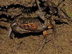 - Esta obra contiene una traducción derivada de «Freshwater crab» de Wikipedia en inglés, publicada por sus editores bajo la Licencia de documentación libre de GNU y la Licencia Creative Commons Atribución-CompartirIgual 4.0 Internacional.