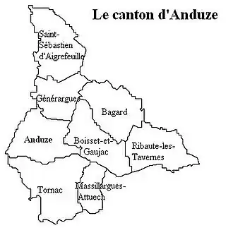 En aplicación del Decreto nº 2014-232[2] de 24 de febrero de 2014, el cantón de Anduze fue suprimido el 22 de marzo de 2015 y sus 8 comunas pasaron a formar parte; cinco del nuevo cantón de Alès-1, dos del nuevo cantón de Quissac y una del nuevo cantón de La Grand-Combe.