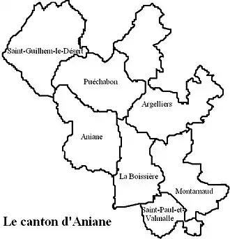 En aplicación del Decreto n.º 2014-258[2] de 26 de febrero de 2014, el cantón de Aniane fue suprimido el 22 de marzo de 2015 y sus 7 comunas pasaron a formar parte del nuevo cantón de Gignac.