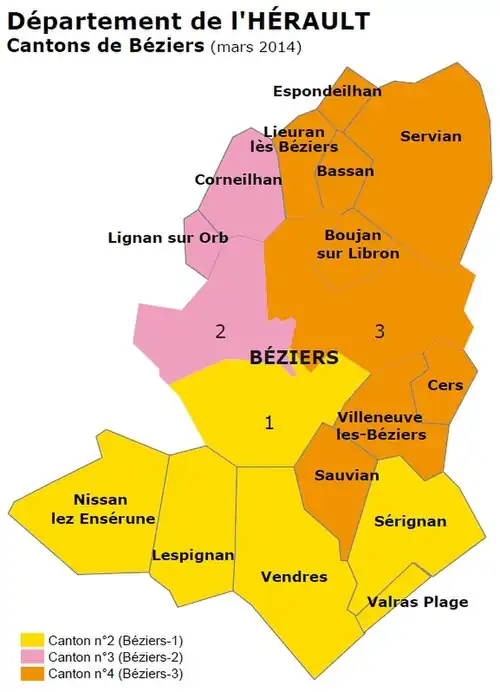 Desde el 22 de marzo de 2015, el cantón de Béziers-3 agrupa 8 comunas:
