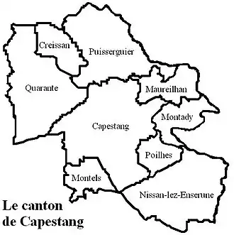 En aplicación del Decreto nº 2014-258[2] de 26 de febrero de 2014, el cantón de Capestang fue suprimido el 22 de marzo de 2015 y sus 9 comunas pasaron a formar parte; seis del nuevo cantón de Saint-Pons-de-Thomières, dos del nuevo cantón de Cazouls-lès-Béziers y una del nuevo cantón de Béziers-1.