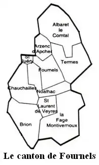 En aplicación del Decreto nº 2014-245[2] de 25 de febrero de 2014, el cantón de Fournels fue suprimido el 22 de marzo de 2015 y sus 10 comunas pasaron a formar parte del nuevo cantón de Aumont-Aubrac.
