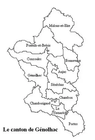 En aplicación del Decreto nº 2014-232[2] de 24 de febrero de 2014, el cantón de Génolhac fue suprimido el 22 de marzo de 2015 y sus 11 comunas pasaron a formar parte del nuevo cantón de La Grand-Combe.