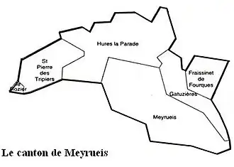 En aplicación del Decreto n.º 2014-245[2] de 25 de febrero de 2014, el cantón de Meyrueis fue suprimido el 22 de marzo de 2015 y sus 6 comunas pasaron a formar parte; cinco del nuevo cantón de Florac y una del nuevo cantón de Le Collet-de-Dèze.