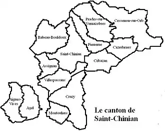 En aplicación del Decreto n.º 2014-258[2] de 26 de febrero de 2014, el cantón de Saint-Chinian fue suprimido el 22 de marzo de 2015 y sus 13 comunas pasaron a formar parte del nuevo cantón de Saint-Piers-de-Thomières.
