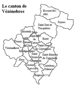 En aplicación del Decreto n.º 2014-232[2] de 24 de febrero de 2014, el cantón de Vézénobres fue suprimido el 22 de marzo de 2015 y sus 17 comunas pasaron a formar parte; once del nuevo cantón de Alès-3, tres del nuevo cantón de Alès-2 y tres del nuevo cantón de Quissac.