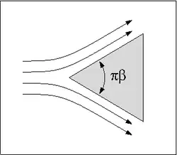 Falkner y Skan generalizaron la capa límite de Blasius considerando una cuña con un ángulo de desde algún campo de velocidad uniforme .[3] La primera hipótesis clave de Falkner y Skan fue que el término de gradiente de presión en la ecuación del momento x de Prandtl podía sustituirse por la forma diferencial del ecuación Bernoulli en el límite del número de Reynolds alto.[4] Así: