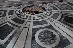 El actual pavimento fue diseñado por Bernini, quien elevó el altar en dos escalones enfatizando su importancia simbólica (el tercer escalón es una adición posterior que interrumpe el patrón decorativo). Los escalones originales, elegantemente moldeados, estaban hechos de bloques monolíticos de mármol estatuario. El pavimento de mármol blanco y gris de bardiglio presenta un motivo geométrico que se corresponde con la decoración de la cúpula. En el centro hay un redondel con incrustaciones de opus sectile, rodeado por un marco de rosas estilizadas y hojas de roble. Dentro de la figura de un esqueleto alado se levanta el escudo de la familia Chigi que simboliza el triunfo de la virtud dinástica sobre la muerte. Debajo de la figura hay un pergamino con una inscripción en latín: Mors aD CaeLos (que significa "a través de la muerte al cielo"). Las mayúsculas suman la fecha de inicio de la reconstrucción en números romanos: MDCL = 1650. El redondel fue ejecutado por el cantero Gabriele Renzi en 1653/54. (Fuentes contemporáneas demuestran que la inscripción era originalmente "Mors aD CaeLos Iter", las letras suman 1651, año en que Fabio Chigi regresó a Roma el último día de noviembre después de su larga ausencia en el extranjero).[23]