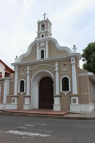 El terremoto en realidad destruyó la parte trasera de la iglesia, pero el característico muro frontal quedó en pie. Posteriormente se reconstruyó el templo teniendo de base el antiguo frontis. Es de notar que la capilla anteriormente estaba ubicada en la misma avenida, pero en la esquina de la calle 14, igualmente al lado de la Biblioteca Julio Pérez Ferrero. Antiguamente se llamaba Iglesia San Juan de Dios.[3]