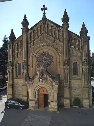 El edificio responde a un diseño realizado por Epalza, donde mezcla los estilos neorrománico y neobizantino. La solución está formada por una nave central, con cabecera recta con unas vidrieras decoradas, representando en las superiores a San Fermín, San Francisco Javier y Santa María la Real. En las inferiores, en el presbiterio, se ven varios escudos y emblemas, presidiendo el espacio un crucifijo colgando sobre el altar.
