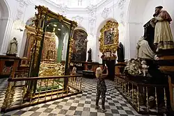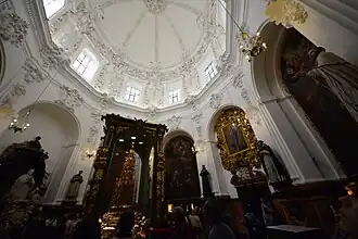 Sobre las puertas que conducen al Tesoro y a la cripta hay sendos lienzos que representan a la Inmaculada Concepción y a la Asunción, procedentes ambos de la escuela granadina, y realizados en el último tercio del siglo XVII. Los marcos de los lienzos fueron tallados y dorados por Teodosio Sánchez de Rueda. Al taller de José de Mora también se atribuyen las demás imágenes del magno recinto, que se hallan sustentadas sobre repisas, y que representan a los santos por los que Salazar profesaba más devoción. Los ocho santos son San Ramón Nonato, San Agustín, San Francisco de Asís, San Bernardo, San Pedro Nolasco, Santo Domingo de Guzmán, San Antonio de Padua y por último, San Francisco de Sales.