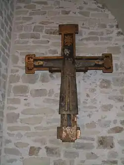 Es indudablemente la pieza más importante conservada en este lugar y uno de los más bellos Cristos románicos de la comarca del Rosellón. Fechado probablemente en el siglo XII, fue dañado por una restauración abusiva en el siglo XVIII: se le dio una nueva capa de pintura y dorado de la cruz. Ha sido restablecido recientemente a un estado más aproximado al original. Durante una restauración anterior se encontró, escondido en el dorso del crucifijo, un pequeño relicario en plata que contenía algunos huesos y grabado con la fecha "1710", correspondiéndose con la restauración mencionada anteriormente. La talla, de factura más cuidada, da una impresión de tranquilidad, con un Cristo con la cabeza ligeramente inclinada a la derecha.